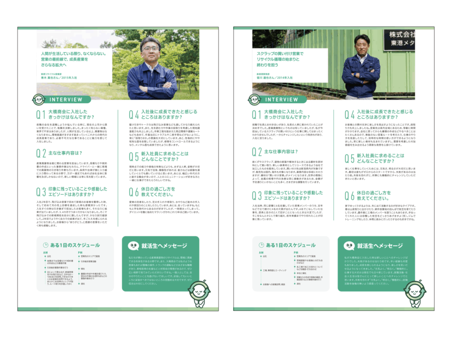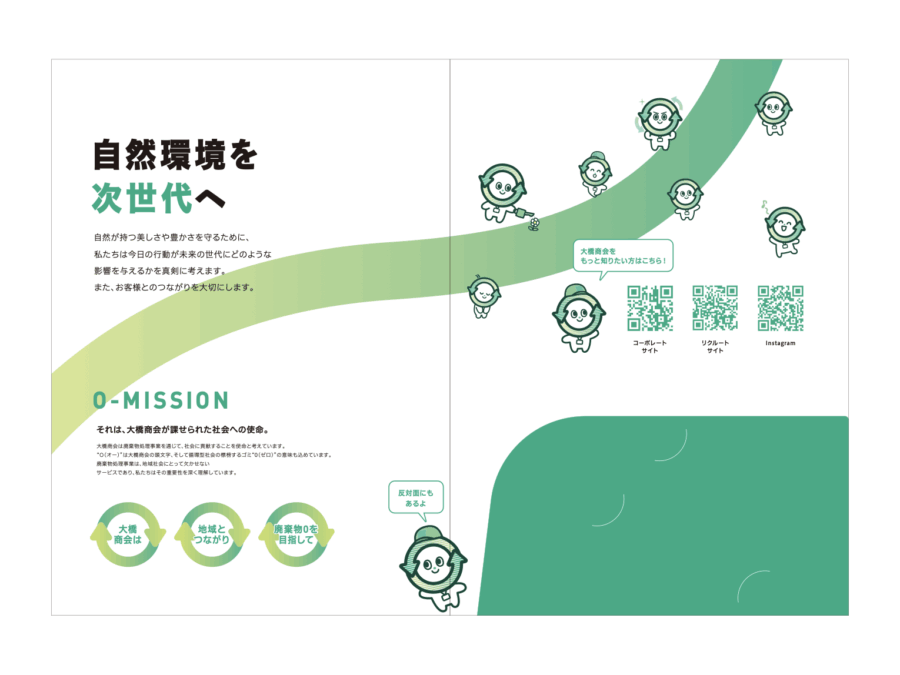 会社案内用ではOちゃんを取り入れつつも、誠実感と信頼感を感じられるデザインに仕上げ、リクルート用ではOちゃんをメインに、親しみやすく楽しい印象に仕上げました。