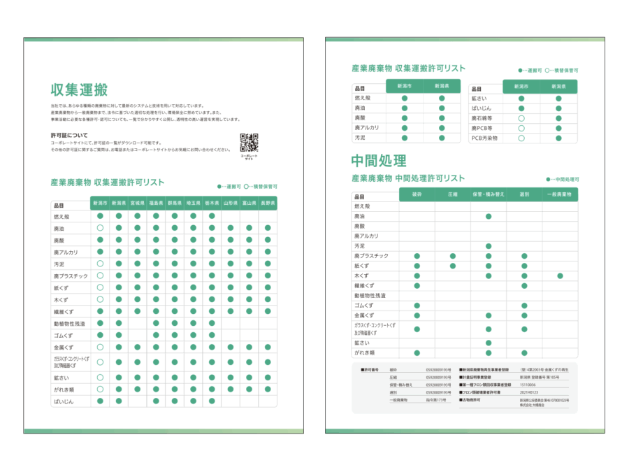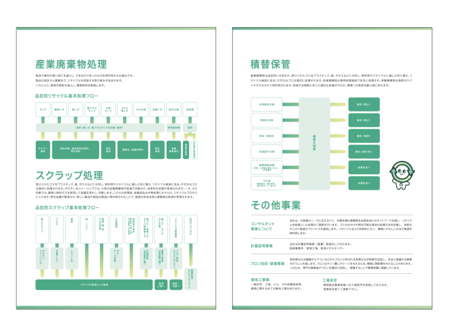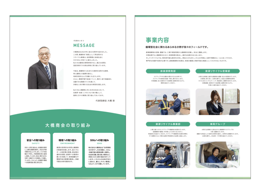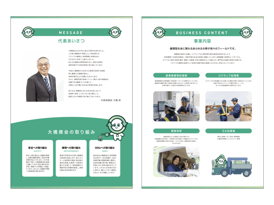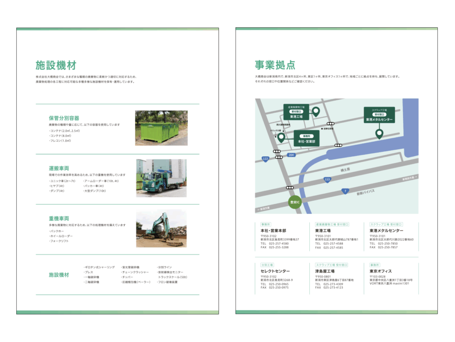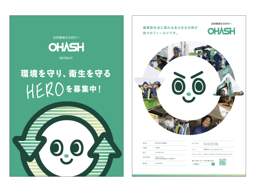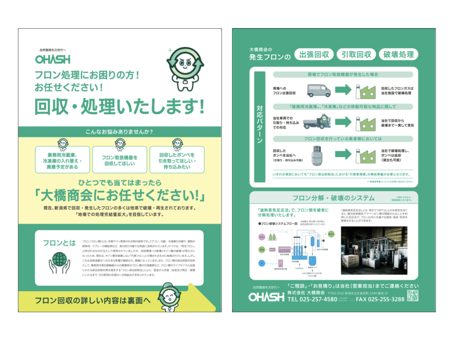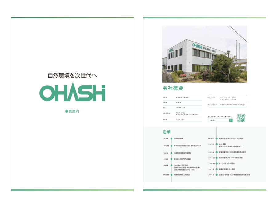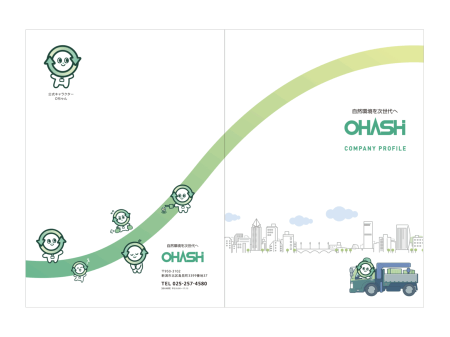 新潟市でリサイクル事業を行う株式会社大橋商会様のポケット付きファイル・会社案内用リーフレット・リクルート用リーフレット・営業用チラシを制作しました。